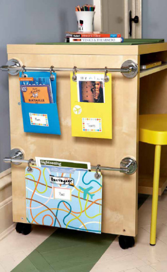 将两条毛巾杆安装到写字台侧面后,装上金属环,再挂上纸质文件袋,附上小标签即可。