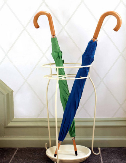 雨伞也有固定的收纳器皿了,它不是现成品,而是由盆栽立架和陶瓷托盘两样东西组成。分别用金属专用涂料和瓷器专用涂料统一它们的颜色,直接立在门口,你就再也不用担心滴水趟得到处都是。
